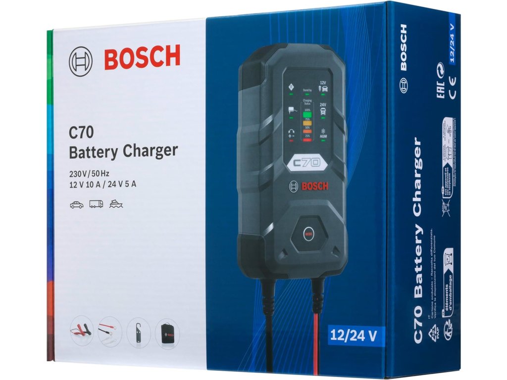 Automatická nabíjačka BOSCH C70je navrhnutá na nabíjanie údržbových aj bezúdržbových VRLA akumulátorov typu olovo-kyselina, ktoré sa používajú pri osobných vozidlách; WET (s tekutým elektrolytom), EFB, AGM aj GEL. Je určená na nabíjanie 12V akumulátorov s kapacitou od 14Ah až 300Ah a 24V akumulátorov 14Ah až 120Ah.