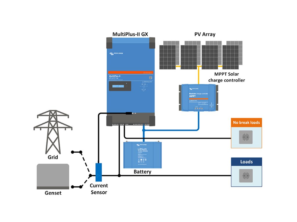 Príklad z mnohých možných zapojení viď. priložená obrázková schéma - Koncepcia hybridného solárneho systému ESS (Energy Storage System) - DC-coupling koncepcia s použitím MPPT solárneho regulátora s umiestnením nezálohovaných spotrebičov mimo MultiPlus-II GX a za použitia prúdového čidla. Nezálohované spotrebiče nie sú napojené na AC výstup, ale na AC vstup. Je použitý prúdový snímač (merací rozsah 0-35A). Spotrebiče na AC out-1 sú napájané prednostne z fotovoltaiky a/alebo batérie, v prípade nedostatku tejto energie alebo preťaženia meniča aj zo siete. V prípade výpadku siete sú napájané z fotovoltaiky a/alebo batérie (ak je tu energia dostupná a nie je preťažený menič). Spotrebiče na AC-out2 sú tiež napájané prednostne z fotovoltaiky a/alebo batérie (cez AC vstup), v prípade nedostatku tejto energie alebo preťaženia meniča aj zo siete. V prípade výpadku siete nie sú tieto spotrebiče napájané (nezálohované spotrebiče). Fotovoltika pri výpadku siete vyrába energiu.