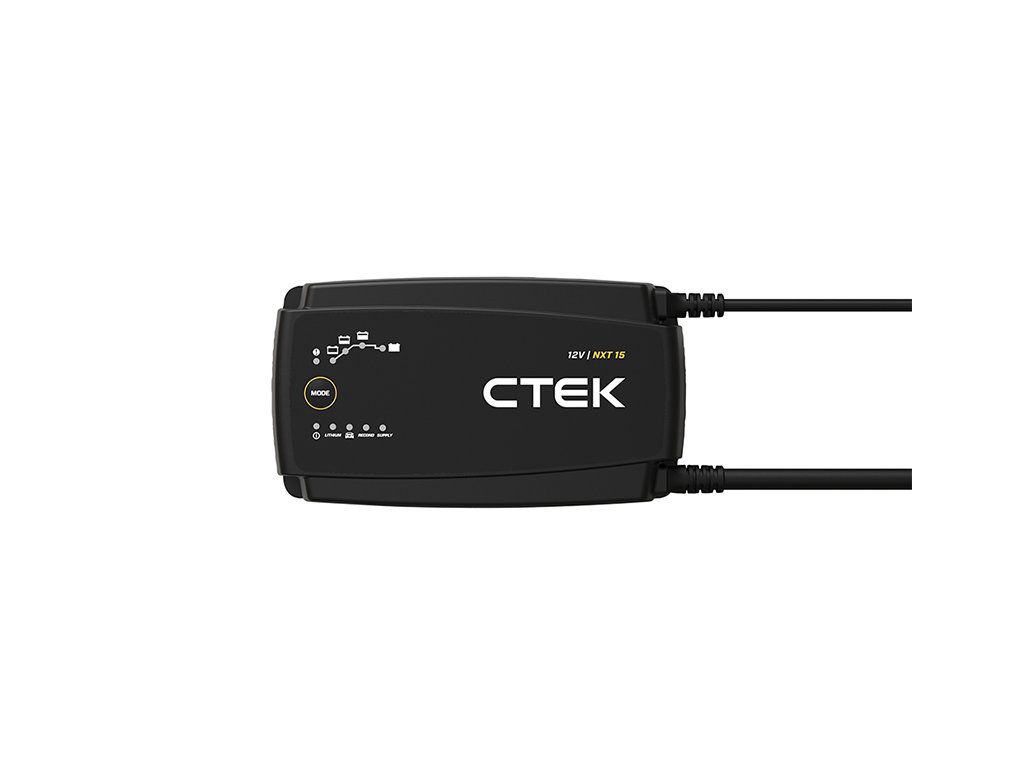 Moderná plne automatická nabíjačka CTEK NXT15 s najvyšším nabíjacím prúdom až 15A určená pre 12V olovené a lítiové batérie s kapacitou až 350Ah (olovené)/300Ah (lítiové).