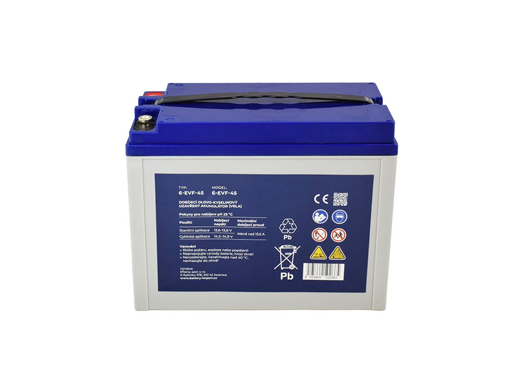 Gelové akumulátory značky GOOWEI ENERGY řada EVF - DEEP CYCLE jsou privátní značkou naší společnosti. Na základě dlouholetých zkušeností v oblasti akumulátorů jsme ve spolupráci s výrobcem kladli důraz na vysokou jakostní kvalitu použitých materiálů (čistost olova), dlouhou cyklickou životnost (extra silné mřížky článků) a maximální spolehlivost a bezpečnost akumulátorů v provozu. Jedná se o uzavřené olověné akumulátory v provedení VRLA. Technologie hybridní GEL = elektrolyt je ztužen v hybridním gelu (kombinace s AGM), a tím je pevně vázán v útrobách článků baterie, čímž je vyloučen jeho únik. Extra silná mřížka článků zajišťuje velmi vysokou cyklickou odolnost (okolo 600 cyklů při 80% D.O.D = hloubka vybití 80%), což tyto akumulátory předurčuje pro aplikace, kde dochází k častému a hlubokému vybíjení / cyklování, tedy hlavně pro pohony elektromotorů. Díky dlouhodobému kontraktu a přímému dovozu ze zakázkové výroby dokážeme tyto kvalitní akumulátory nabízet za velmi příznivé ceny! Výborný poměr cena / kvalita / výkon řadí akumulátory GOOWEI ENERGY k nejprodávanějším akumulátorům na trhu.