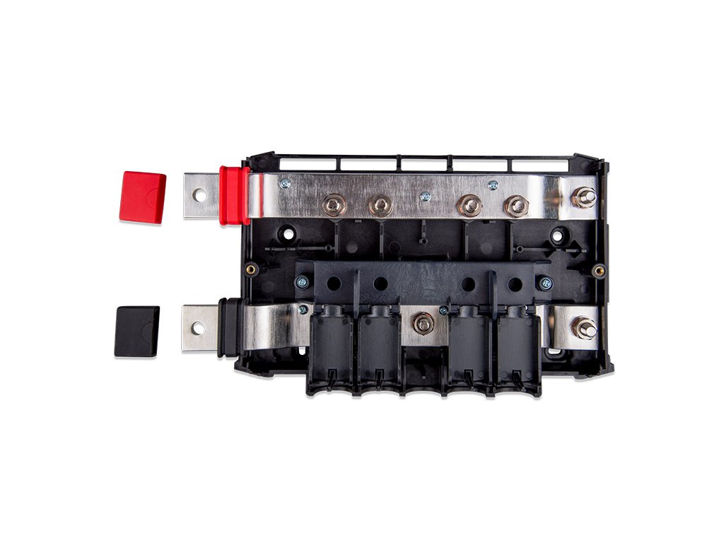 Modulárna prípojnica Lynx Power In sa používa na prepojenie batérií prostredníctvom externej poistky. To môže byť užitočné, ak potrebujete prepojiť viac batérií paralelne. Vzhľadom k extrémne vysokému skratovému prúdu vo väčšine batériových bánk sa odporúča použiť externý poistkový systém so zodpovedajúcim stupňom vybavenia poruchového prúdu (ako je NH HRC).
